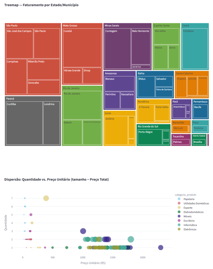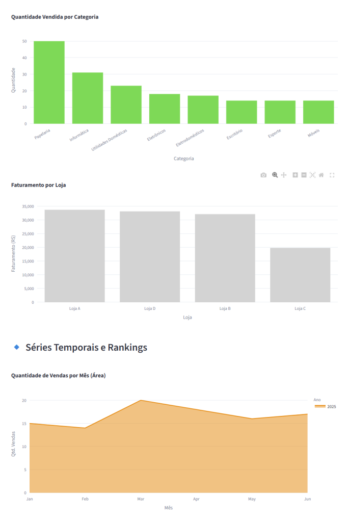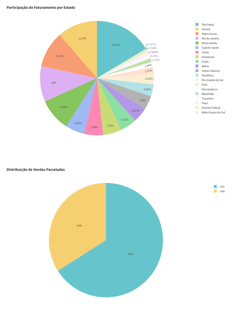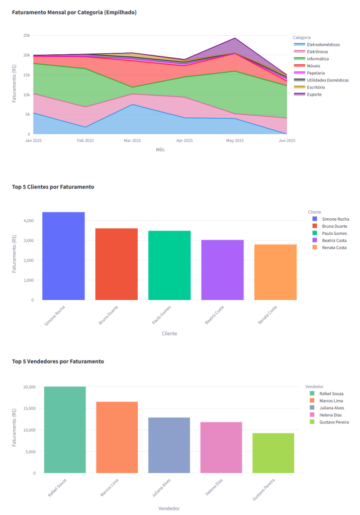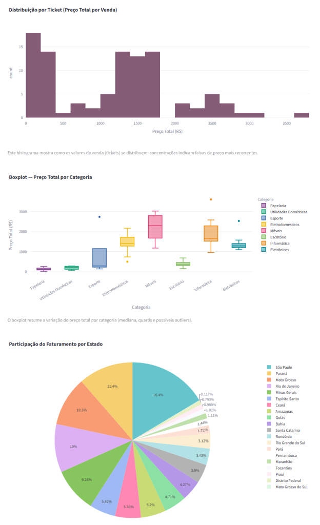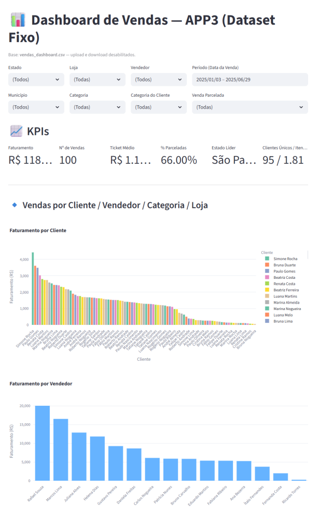 Com Streamlit, transformamos dados em resultados. Nossa empresa desenvolve dashboards interativos e dinâmicos que permitem acompanhar indicadores de vendas, metas, desempenho de produtos e tendências de mercado de forma simples e rápida. As aplicações criadas com essa tecnologia entregam visualizações claras, atualizadas e acessíveis de qualquer lugar, facilitando decisões mais ágeis e estratégicas. Nos exemplos ao lado, apresentamos como utilizamos o Streamlit para converter grandes volumes de dados em insights imediatos, ajudando nossos clientes a identificar oportunidades, aumentar eficiência e impulsionar crescimento. Nas figuras abaixo temos, capturas de telas, de um exemplo de dashboard dinâmico feito com Python e Streamlit, sobre um dataset de vendas.