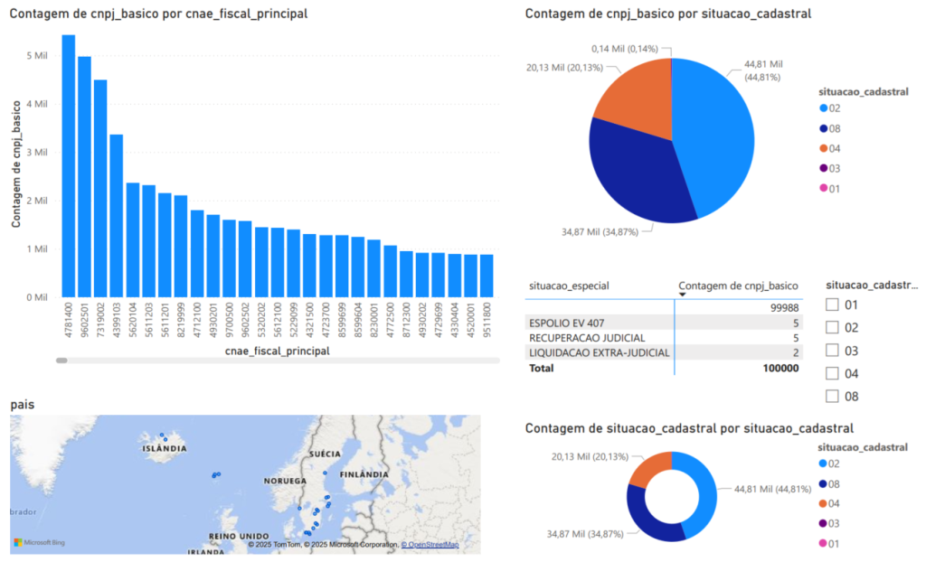 O Power BI é uma das principais ferramentas utilizadas pela nossa empresa para transformar dados em decisões estratégicas. Com ele, desenvolvemos painéis visuais modernos, interativos e de alto impacto, capazes de revelar padrões, projeções e oportunidades de negócio em poucos segundos. Os dashboards exibidos — um com a análise populacional e outro voltado para investigação e segmentação de CNPJs — demonstram como combinamos design intuitivo com análises avançadas para entregar uma visão clara e objetiva do cenário estudado. Essa abordagem permite que gestores e equipes tomem decisões mais inteligentes, reduzem riscos e explorem insights que impulsionam crescimento e eficiência operacional. Análise da população por micro e meso região.